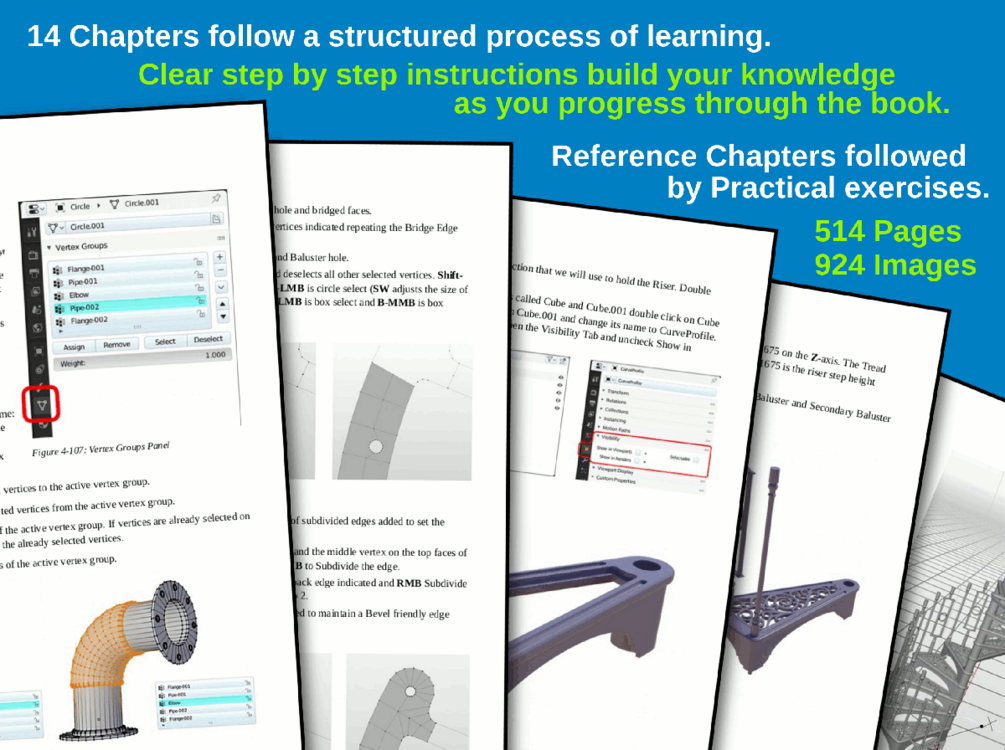 The practical guidance uses two main projects to demonstrate the use of the various tools, a basic low‑poly house and a detailed Spiral Staircase. The projects follow through the various reference chapters of the book, so as you progress through the book, you learn about Materials, Textures, Lighting, Rendering and Animation. The introductory chapters to Materials,Textures, Lighting, Rendering and Animation gives a brief outline to their principals and are then demonstrated by applying them to the models you have created.